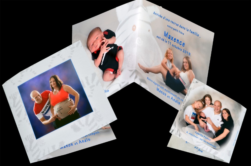 Naissance, anniversaire, départ en retraite, remerciement, etc… Un prototype sera composé à partir des éléments que vous nous confiez (photos, textes, instructions ) . Aprés approbation, les faire-parts seront imprimés rapidement.